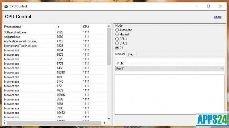 CPU-Control is a utility with a free license that is equipped with precise tools for adjusting CPU operation. The main subject of tuning, which provides the functionality of the program, is the selection of the mode of use of cores in multi-core processors.