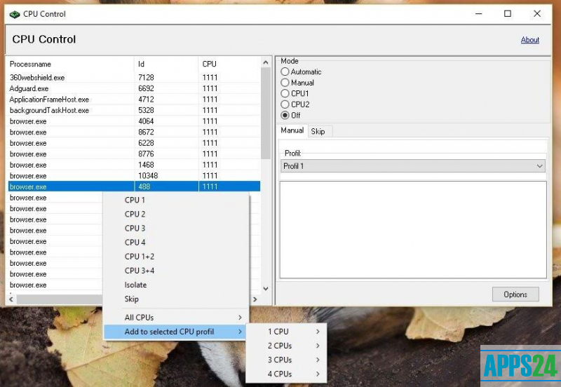 CPU-Control is designed to configure systems running on Windows platforms. Windows distributes the priority of access to hardware power among all the running processes at the moment of startup. This approach does not always justify the means, sometimes a point-by-point power allocation technique is required. CPU-Control helps when it is necessary to equally distribute processes across cores, which markedly increases the final performance of the system.
